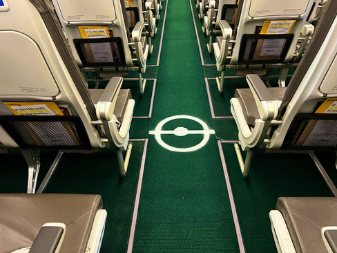 En su interior se simula un campo de fútbol incorporando el círculo central al pasillo. Además cada asiento tiene el cabezal personalizado con los colores azul y grana y el lema 'Dream, Play, Fly'. Las ventanas también incorporan un mensaje ligado a la alianza y en el fuselaje, bajo la ventana del piloto, se puede leer el nombre de esta unión, 'Blaugranes al vent'.